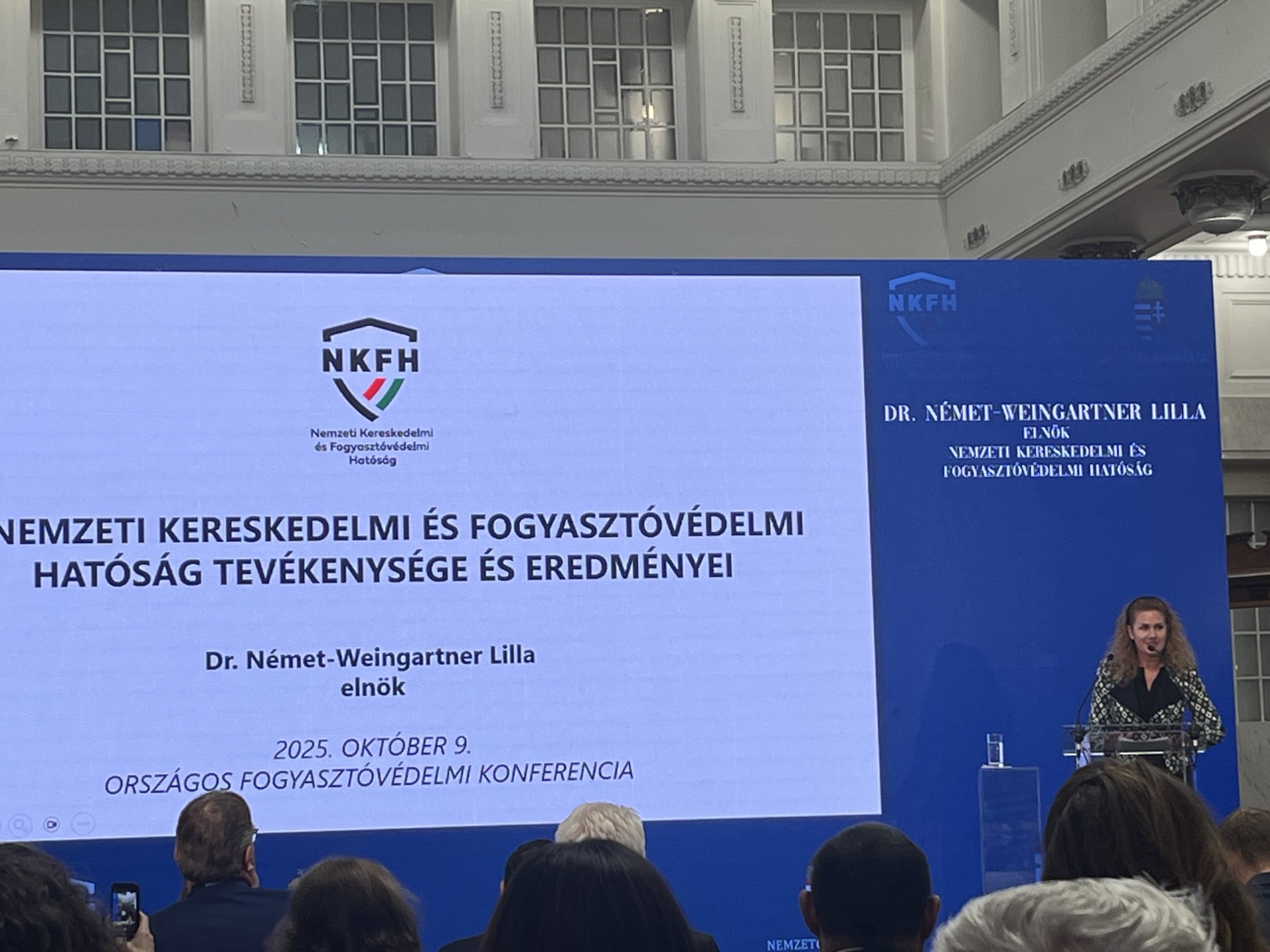 A konferencia kiemelten foglalkozott a bő kilenc hónapja felálló NKFH működésével és eredményeivel is. „2025-ben a hatóság megerősítette jelenlétét mind a fogyasztóvédelem, mind az élelmiszer-kereskedelem és piacfelügyelet területén. Csaknem 10 ezer országos fogyasztóvédelmi hatósági és több mint 10 ezer élelmiszer-biztonsági ellenőrzést koordináltunk, mintegy 2,2 milliárd forint fogyasztóvédelmi bírságot szabtak ki a kormányhivatali munkatársak, de az NKFH-hoz eddig beérkező fogyasztói megkeresések száma is meghaladta a 6 ezret. Külön büszkeség számunkra, hogy az Európai Unió termékbiztonsági rendszerében Magyarország továbbra is az élvonalban van a veszélyes termékek kiszűrésében. Az NKFH célja, hogy tovább erősítse a fogyasztók biztonságát és a vállalkozások jogkövető működését.” – emelte ki előadásában dr. Német-Weingartner Lilla, az NKFH elnöke.